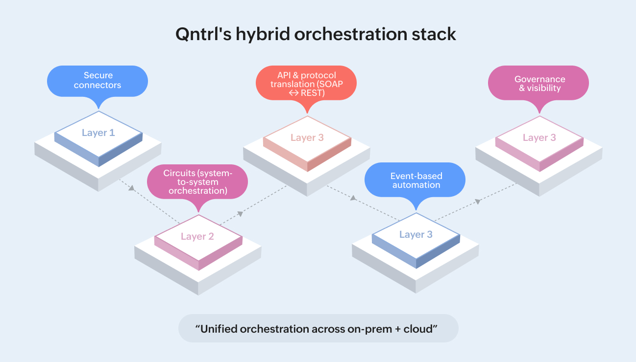 Qntrl is built as an orchestration engine that unifies on-prem systems, cloud applications, and internal tools through a structured layer of governance, automation, and integration control. Its capabilities allow IT teams to replace point-to-point scripts with a sustainable architecture built for long-term growth.