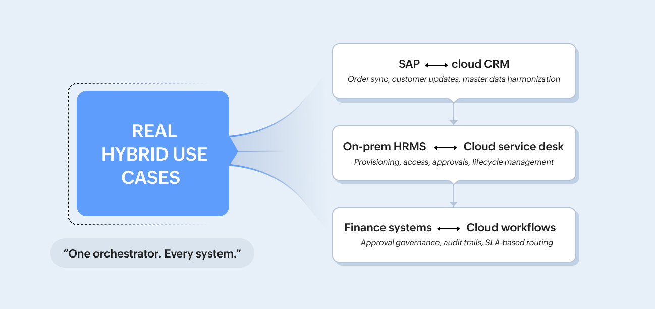 Enterprises evolve in different ways, and rarely run on a single model, shaped uniquely by their teams and workflows. As a result, most organizations operate in a hybrid environment that spans on-prem systems, cloud applications, and legacy technology.