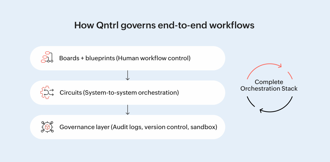 By linking human approvals with system actions, Qntrl establishes a governance layer that spans the entire process.