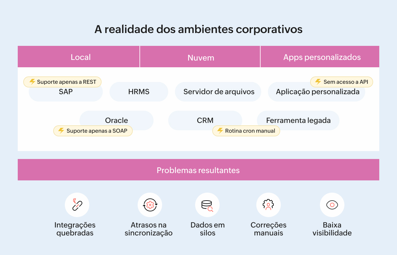 Sem integrações estruturadas, as equipes de TI acabam mantendo o ambiente funcionando na base da intervenção manual: corrigindo sincronizações quebradas, transferindo dados entre sistemas e coordenando processos entre áreas.