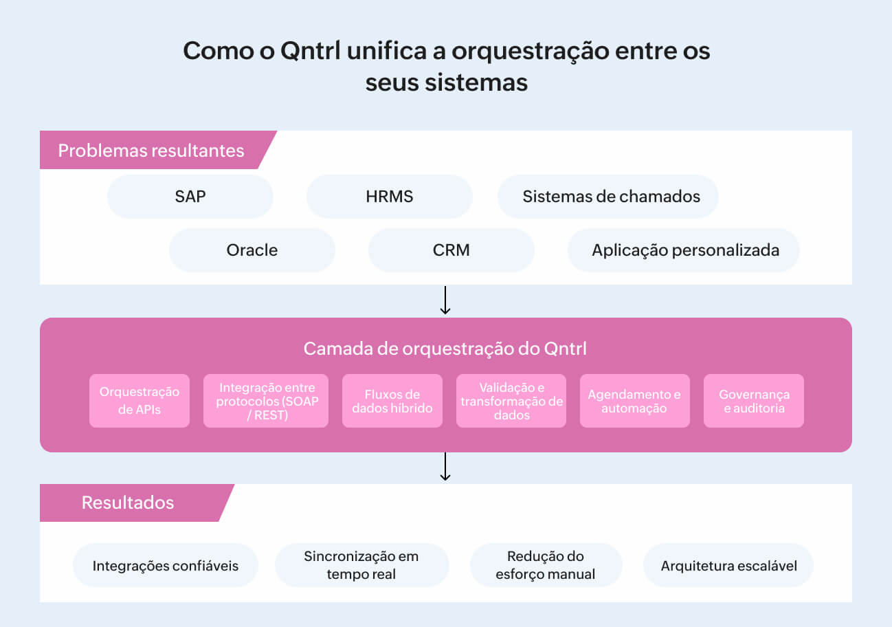 Para eliminar o débito técnico da integração entre sistemas, as empresas precisam de estrutura, visibilidade e de um ponto central de governança que organize como os sistemas se comunicam. Em outras palavras, de uma verdadeira orquestração de processos e sistemas. O Qntrl torna isso possível por meio de três camadas interligadas: